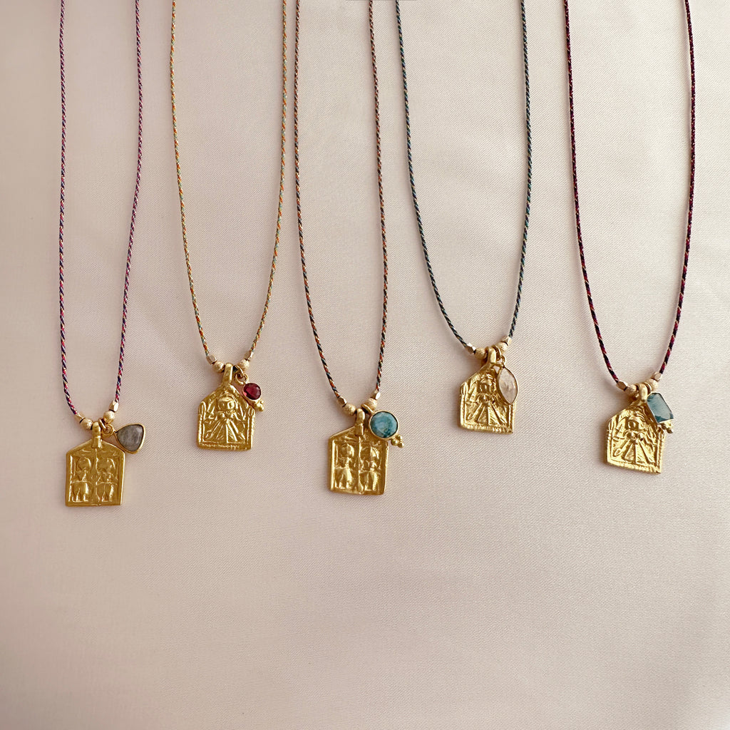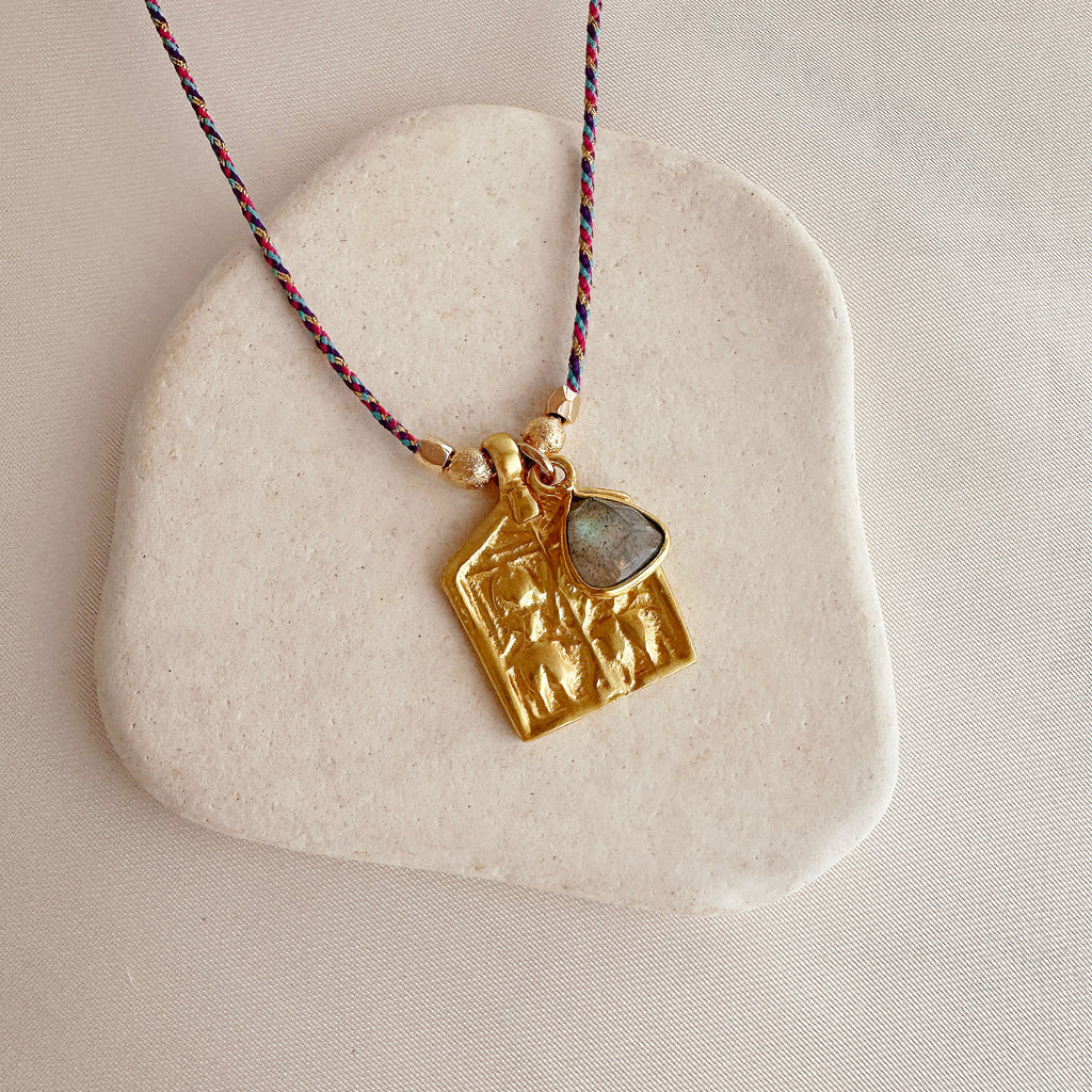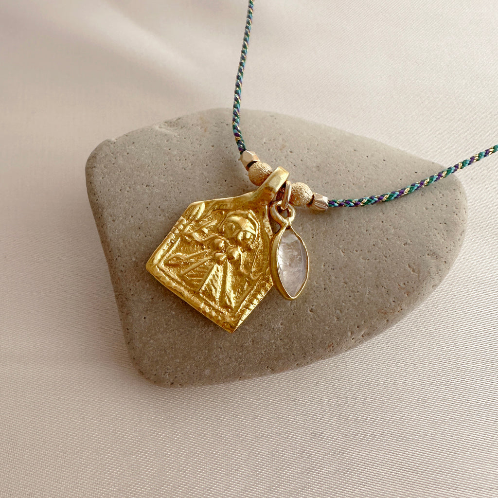 Joli collier en cordelette multicolore ornée d’une médaille indienne, de perles en métal et d’une jolie pierre en gemme.