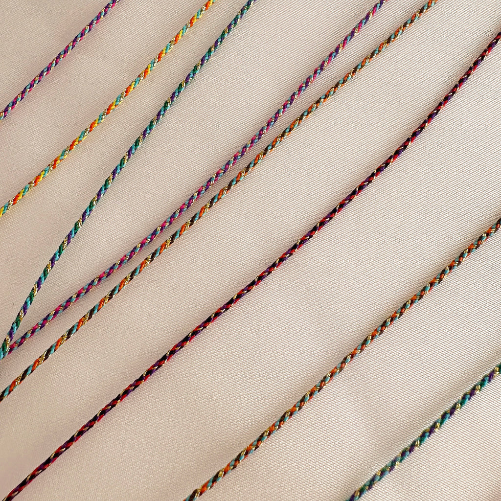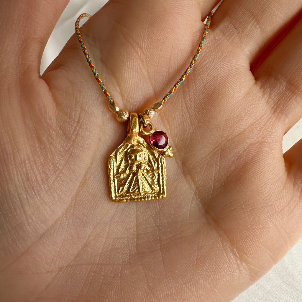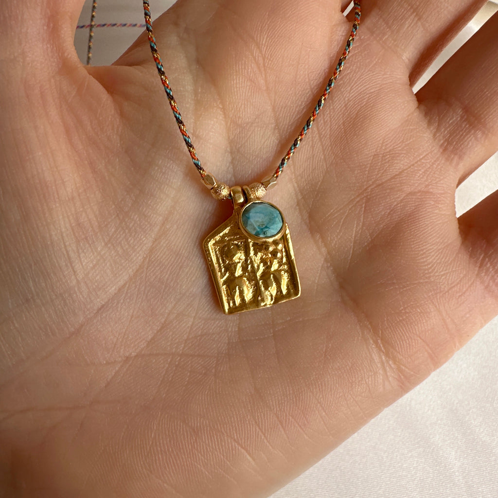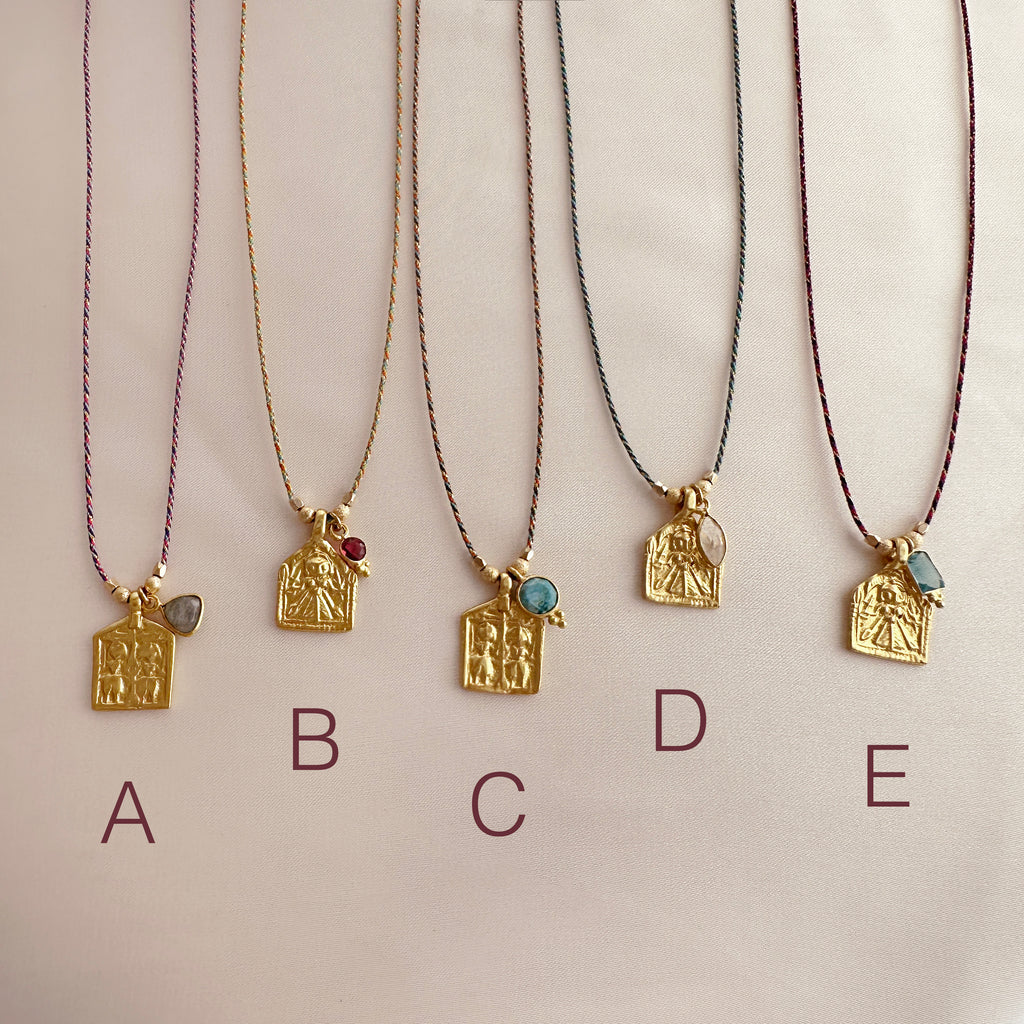 Joli collier en cordelette multicolore ornée d’une médaille indienne, de perles en métal et d’une jolie pierre en gemme.