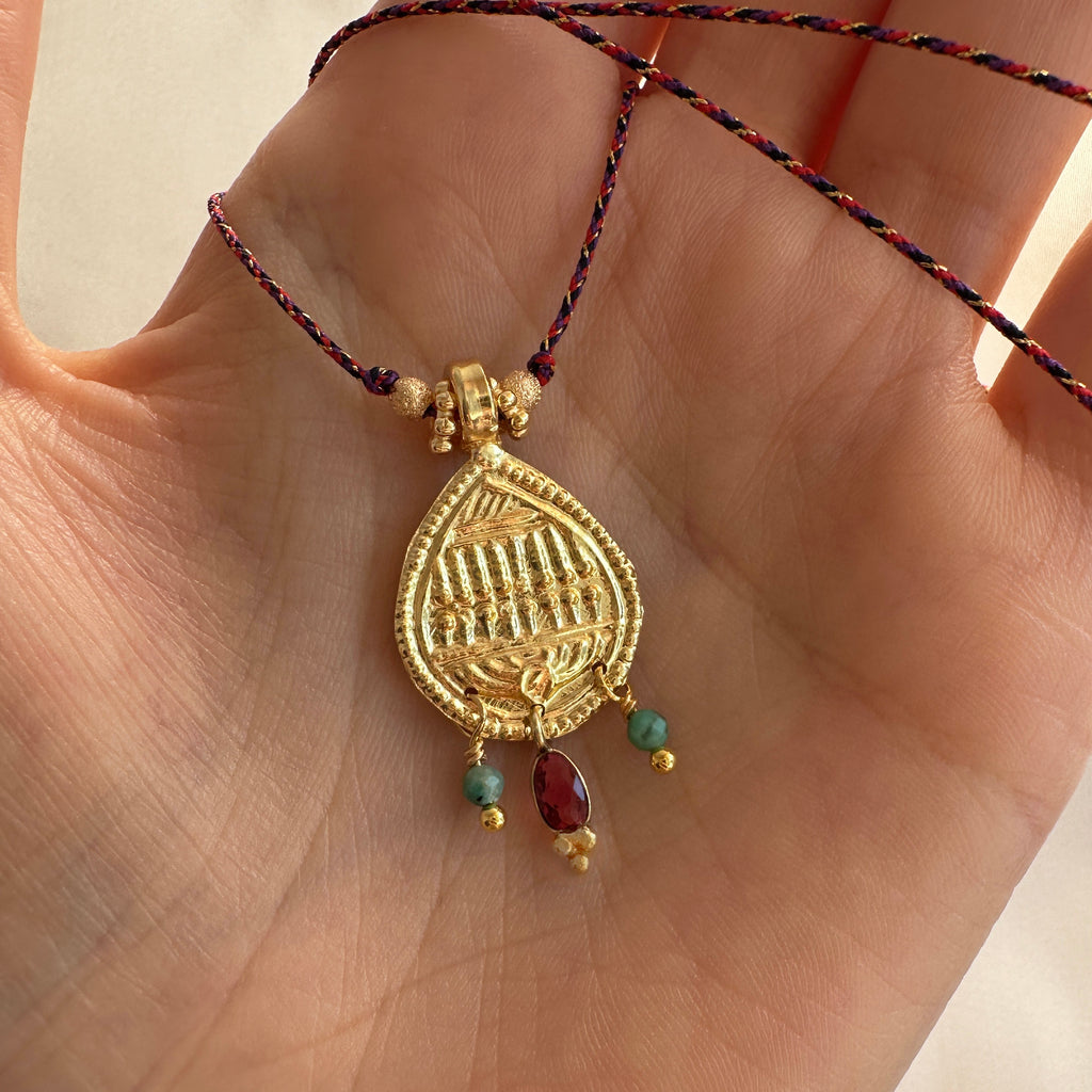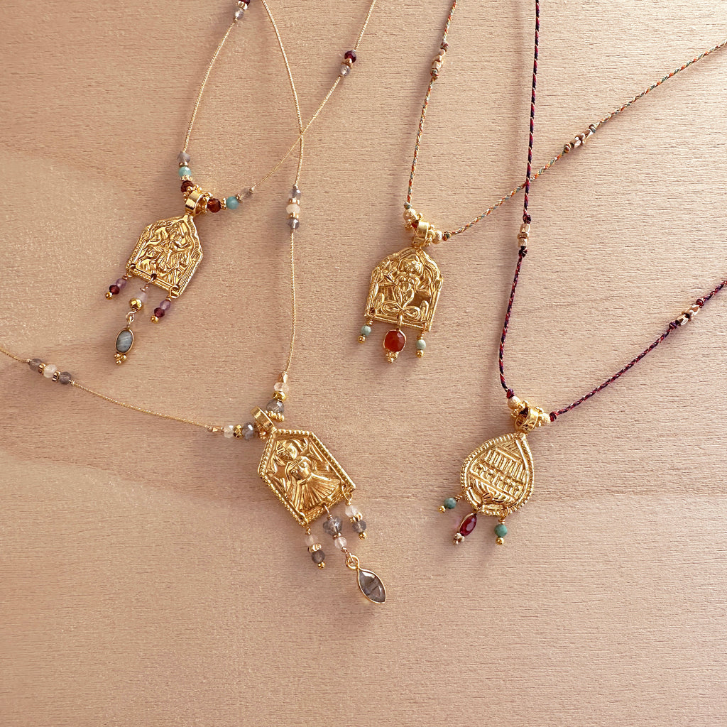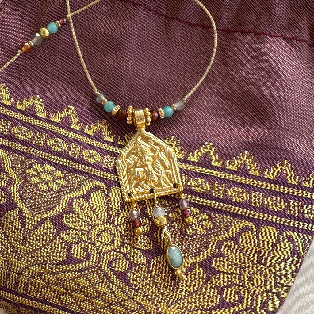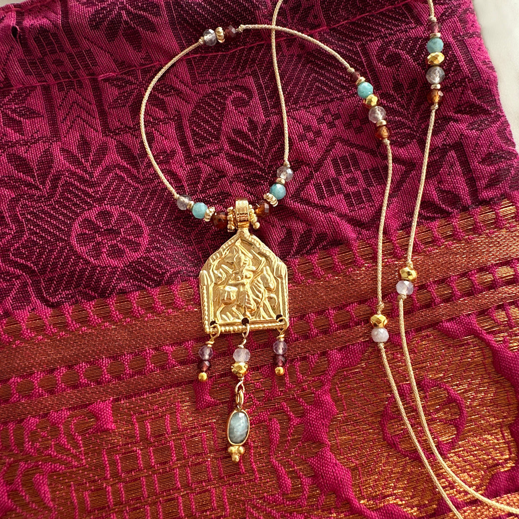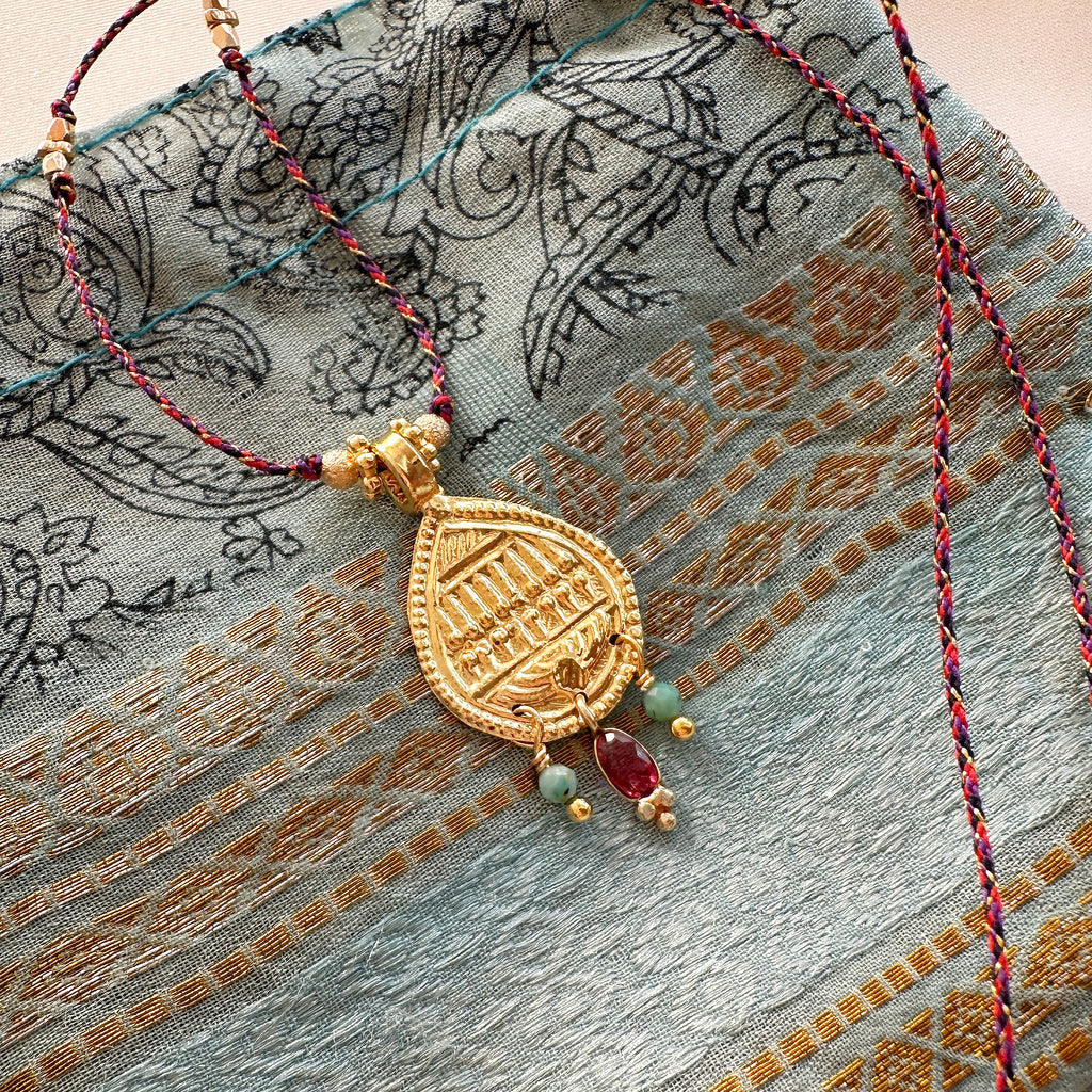 Joli collier en cordon orné d’une médaille indienne, de perles en métal et de pierres de gemme.