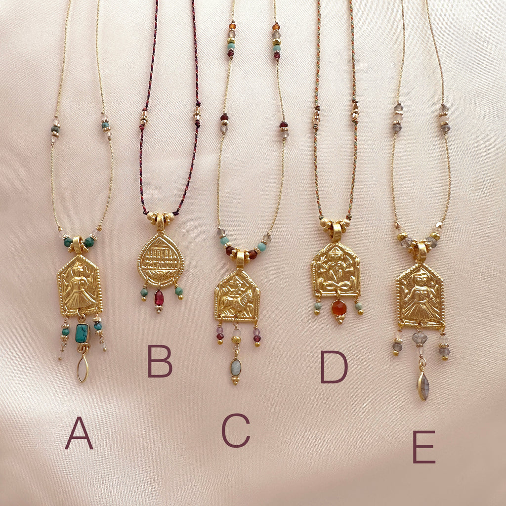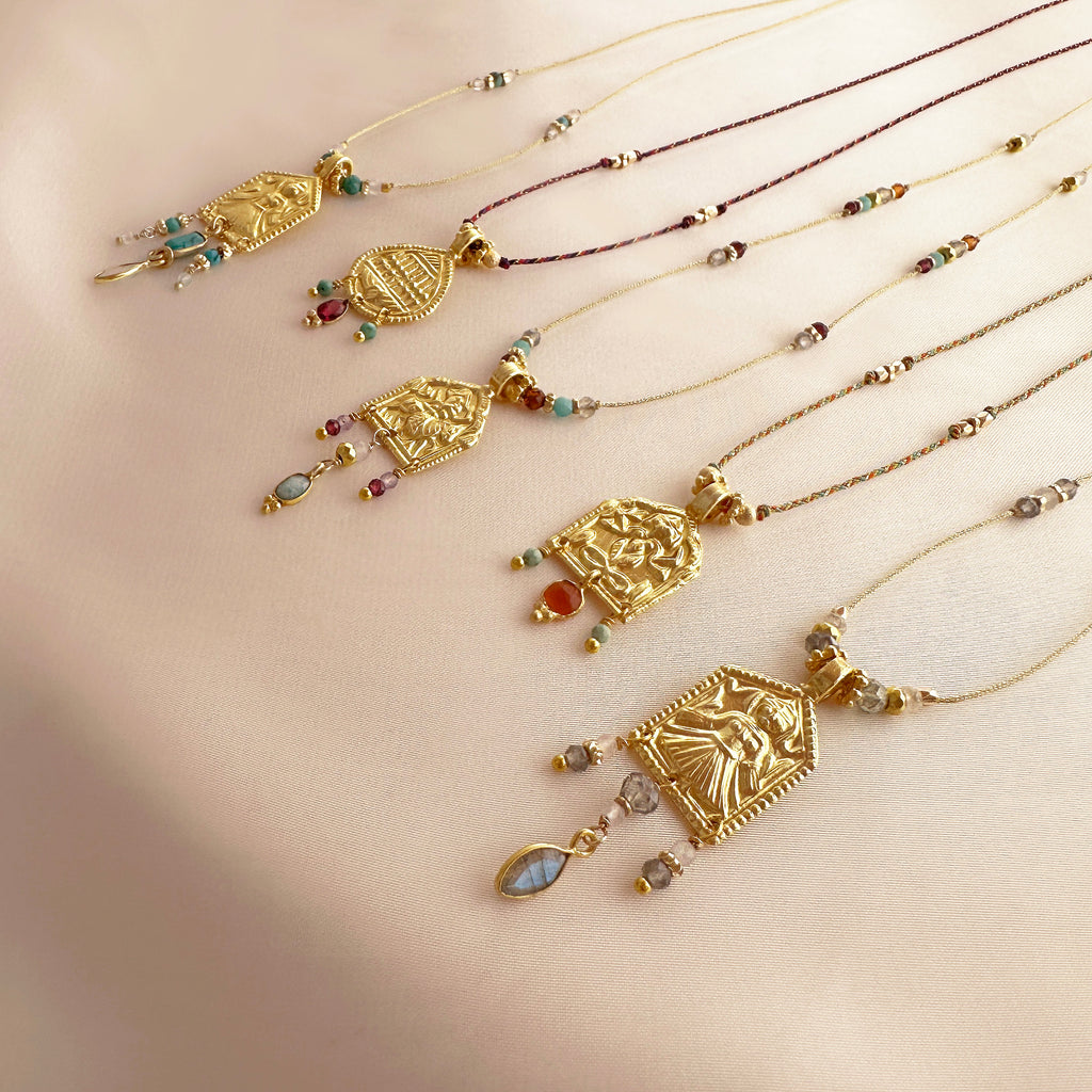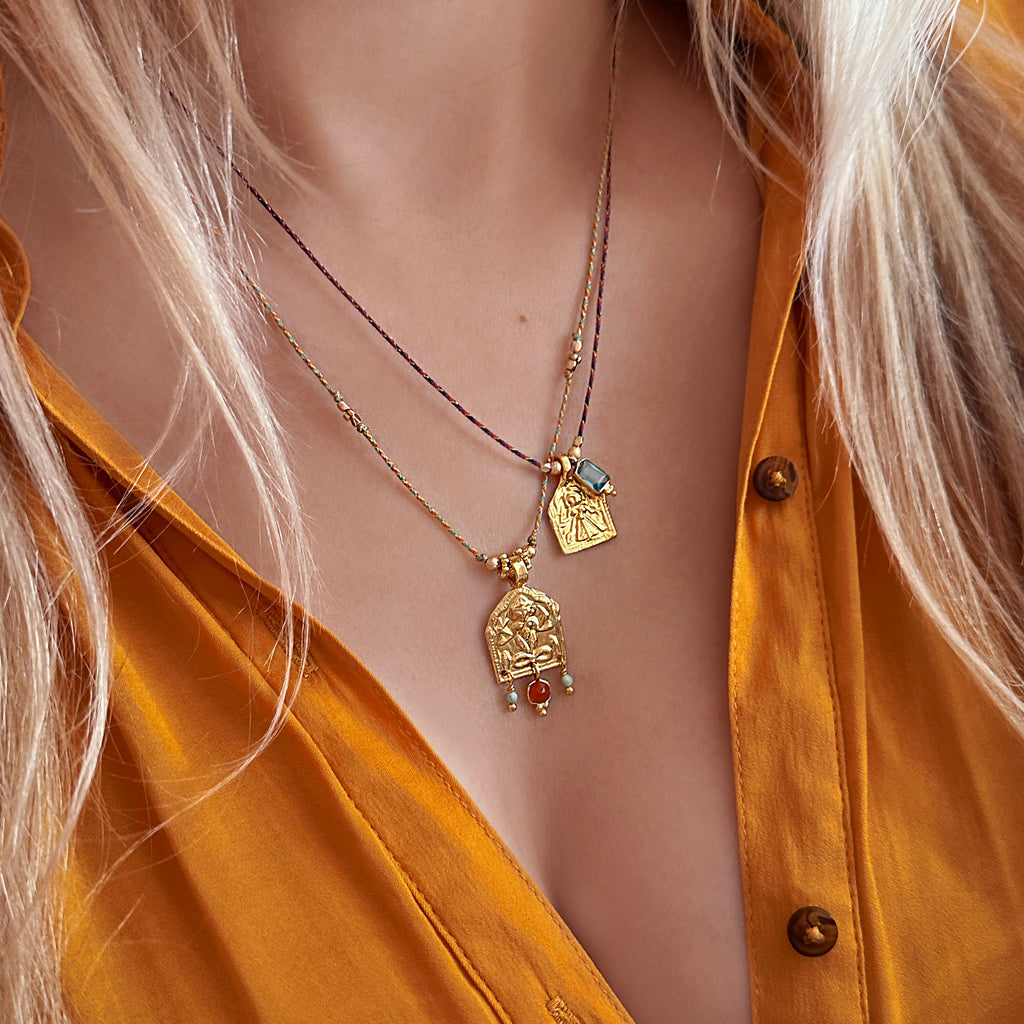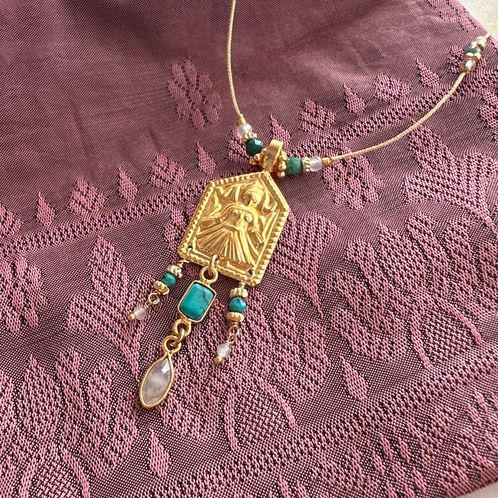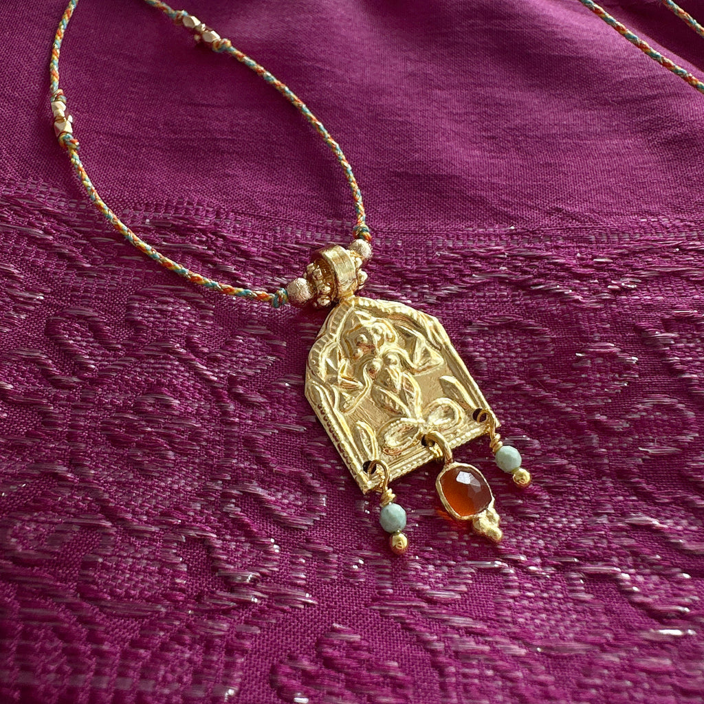 Joli collier en cordon orné d’une médaille indienne, de perles en métal et de pierres de gemme.