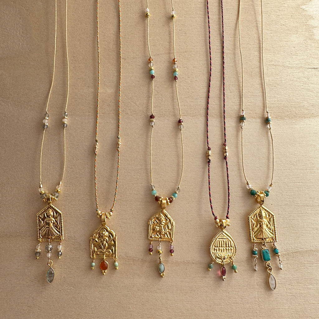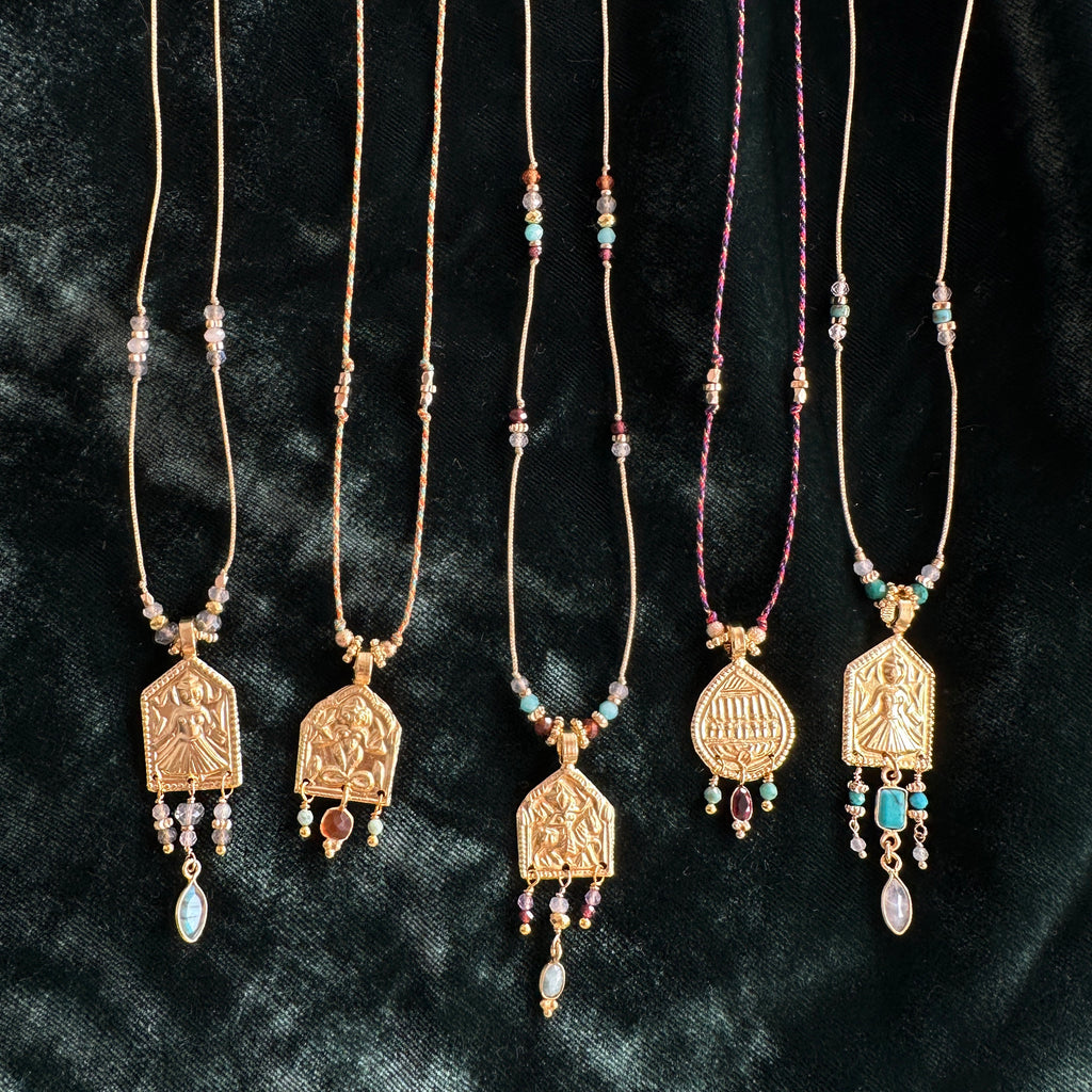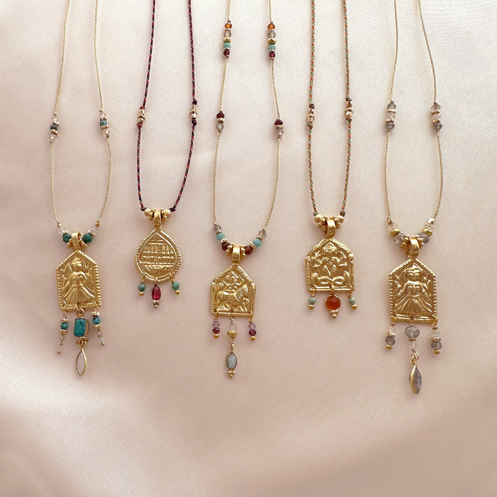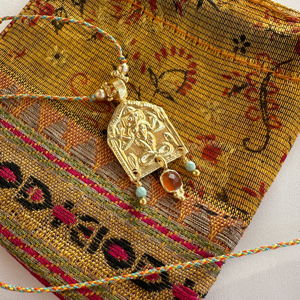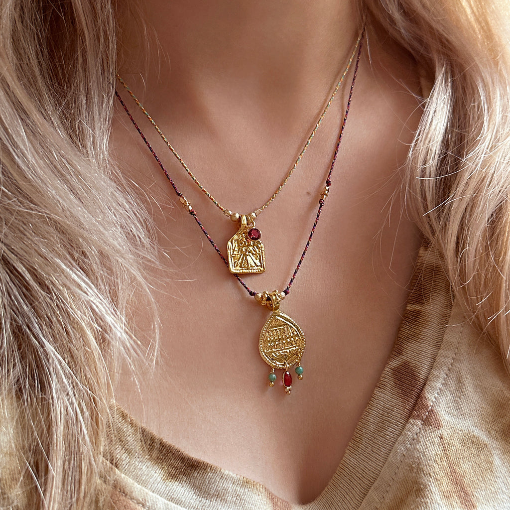 Joli collier en cordon orné d’une médaille indienne, de perles en métal et de pierres de gemme.