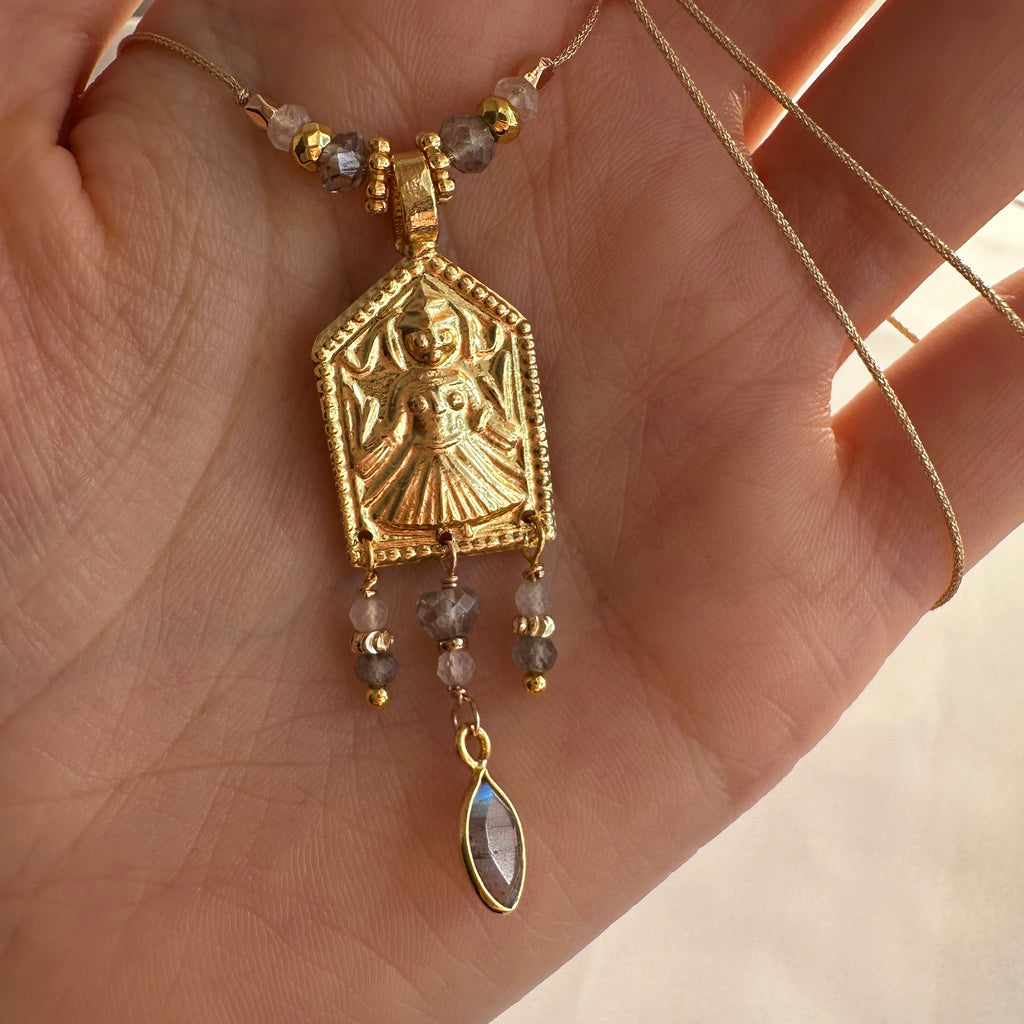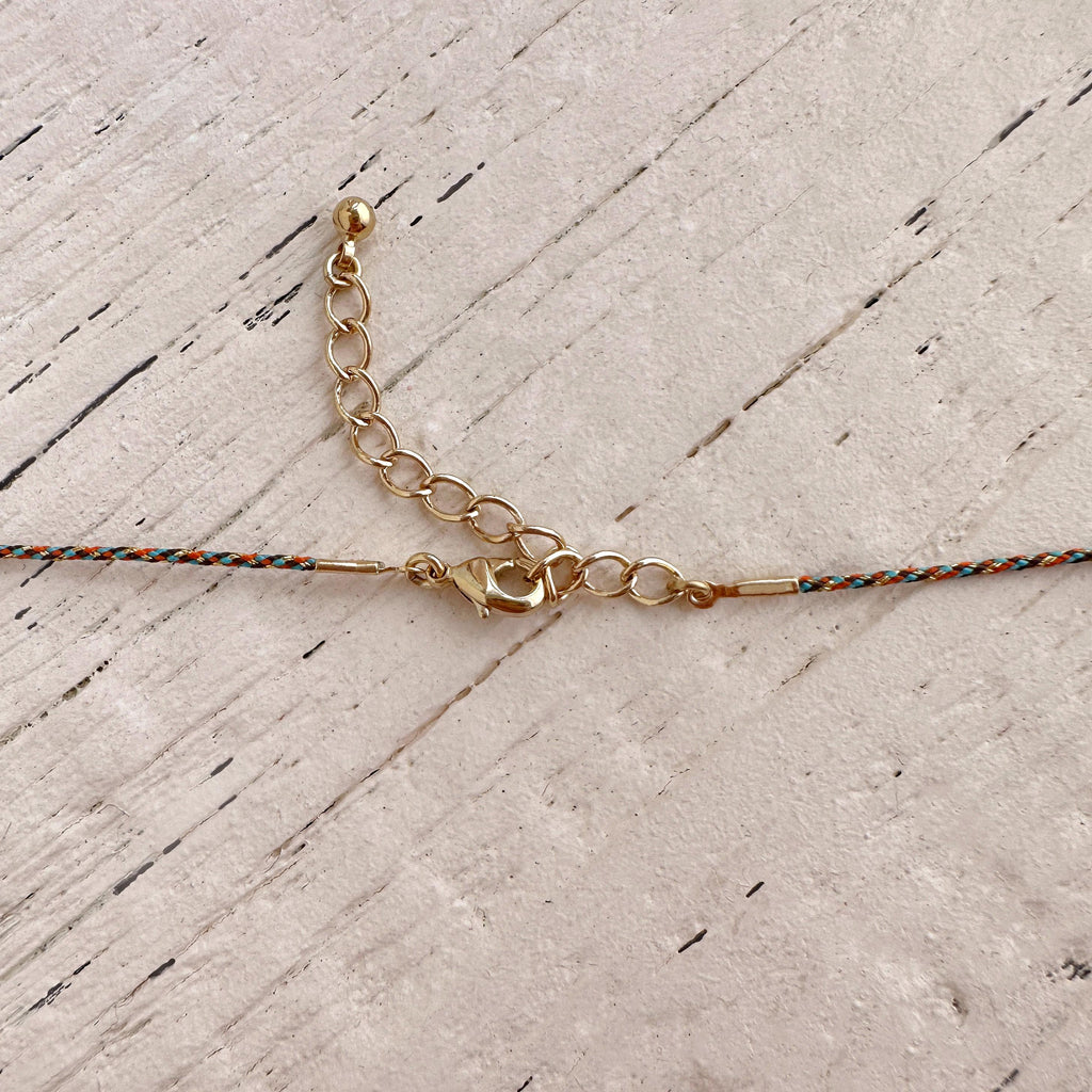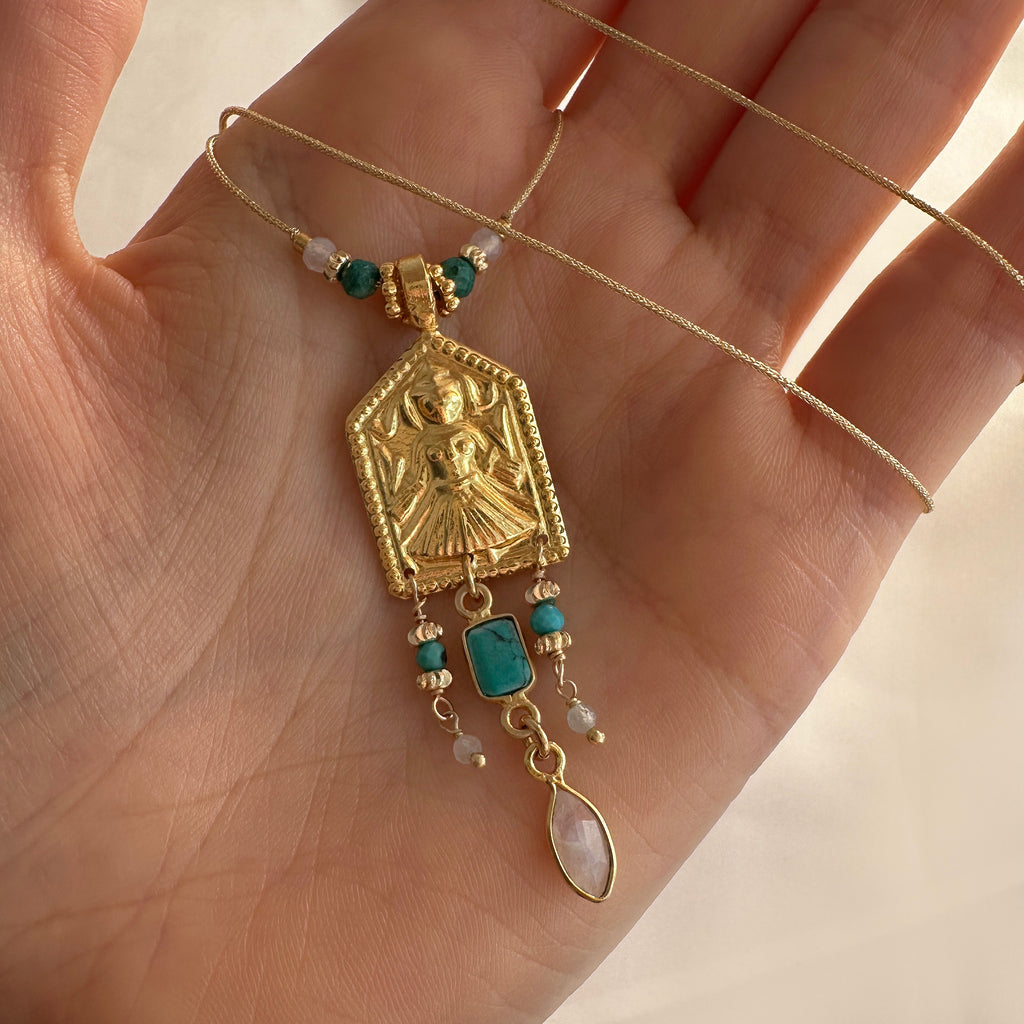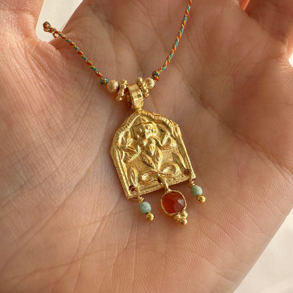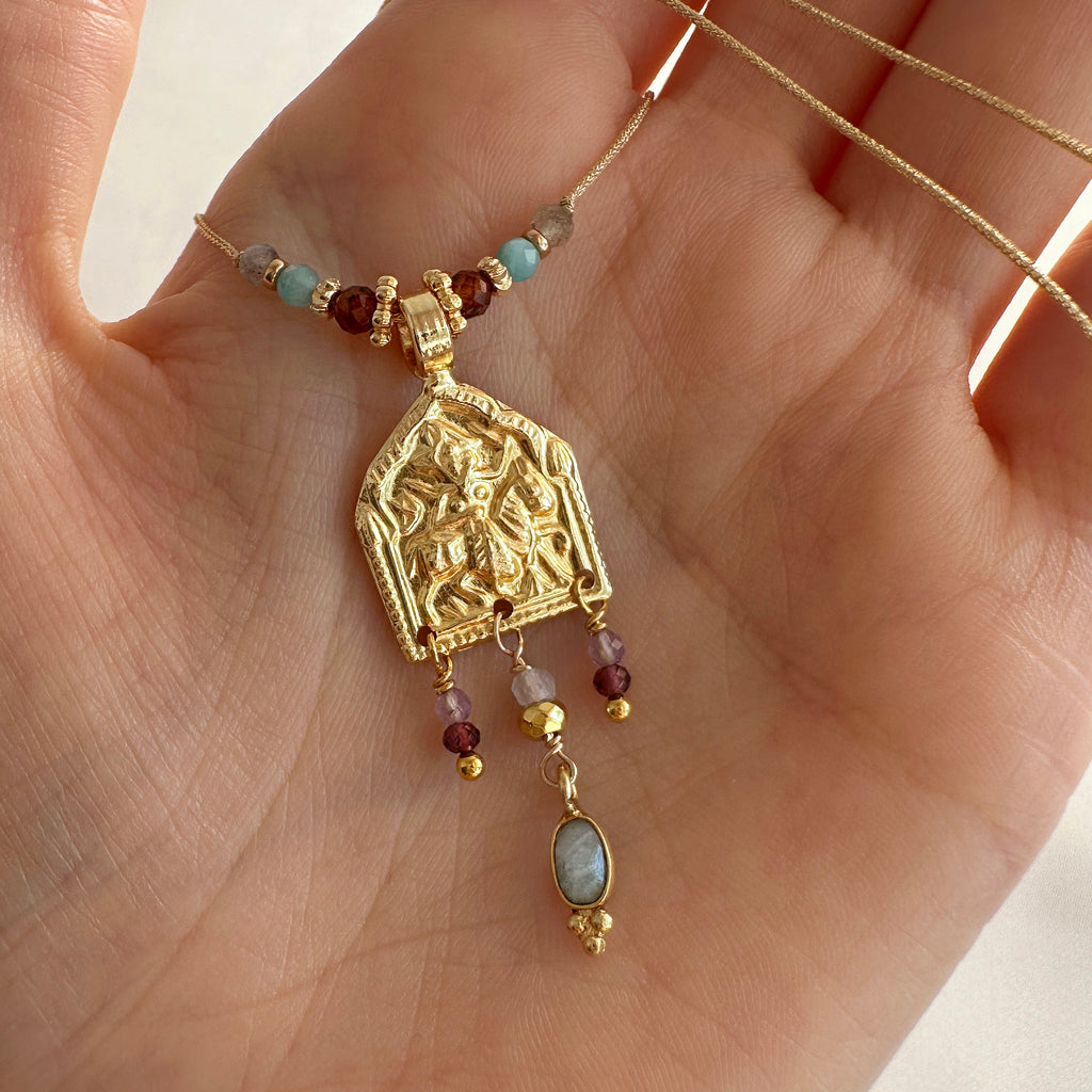 Joli collier en cordon orné d’une médaille indienne, de perles en métal et de pierres de gemme.