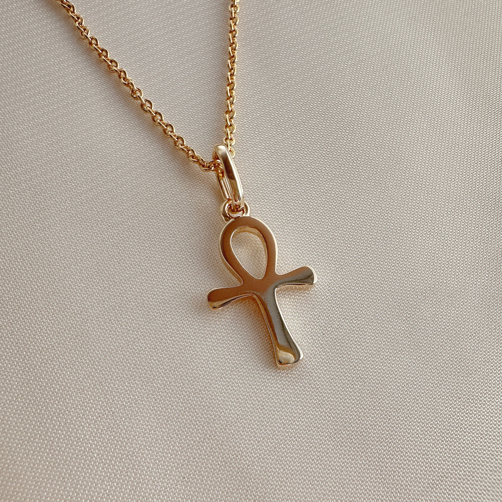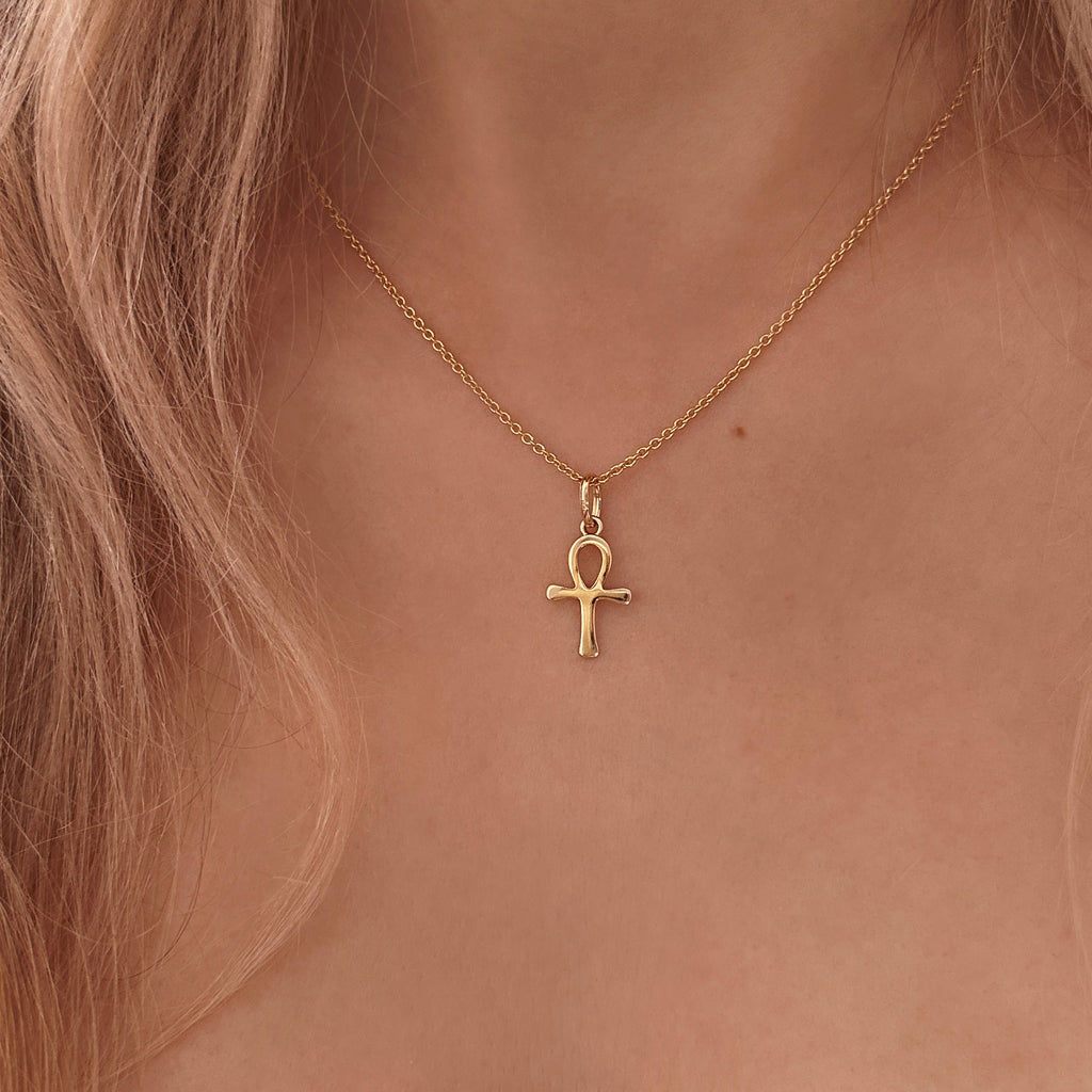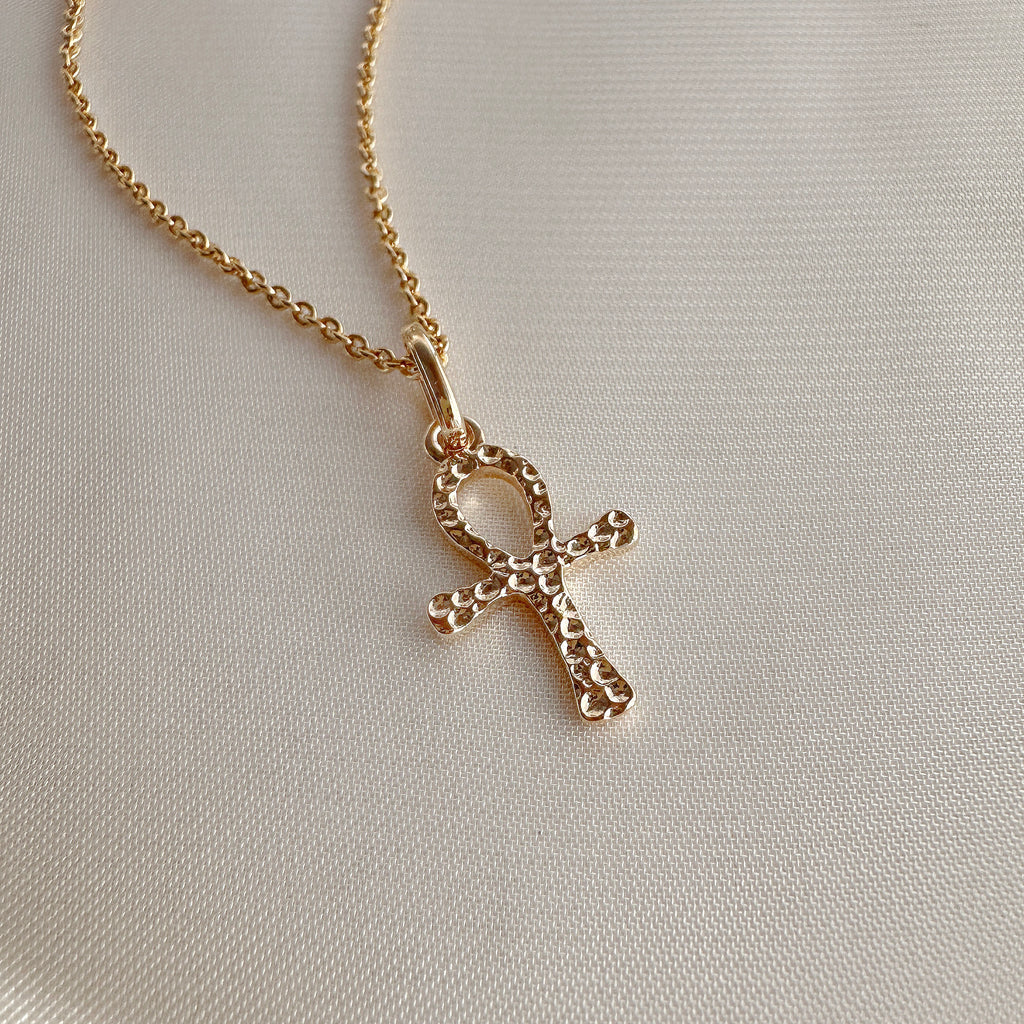 Small gold egyptian ankh cross hanging on a dainty chain.